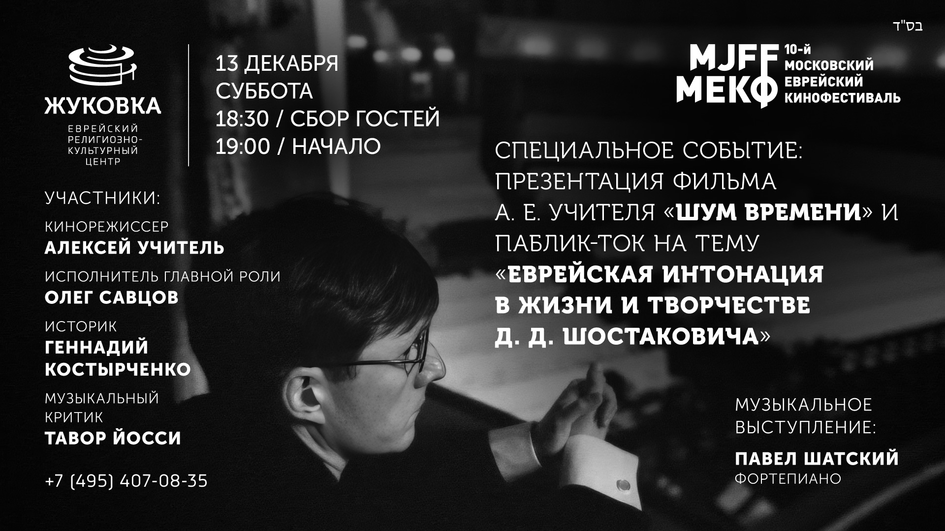 13 декабря в «Жуковке» пройдет специальное событие в рамках Московского еврейского кинофестиваля (МЕКФ): презентация фильма А.Е. Учителя «Шум времени» и паблик-ток на тему «Еврейская интонация в жизни и творчестве Д.Д. Шостаковича».