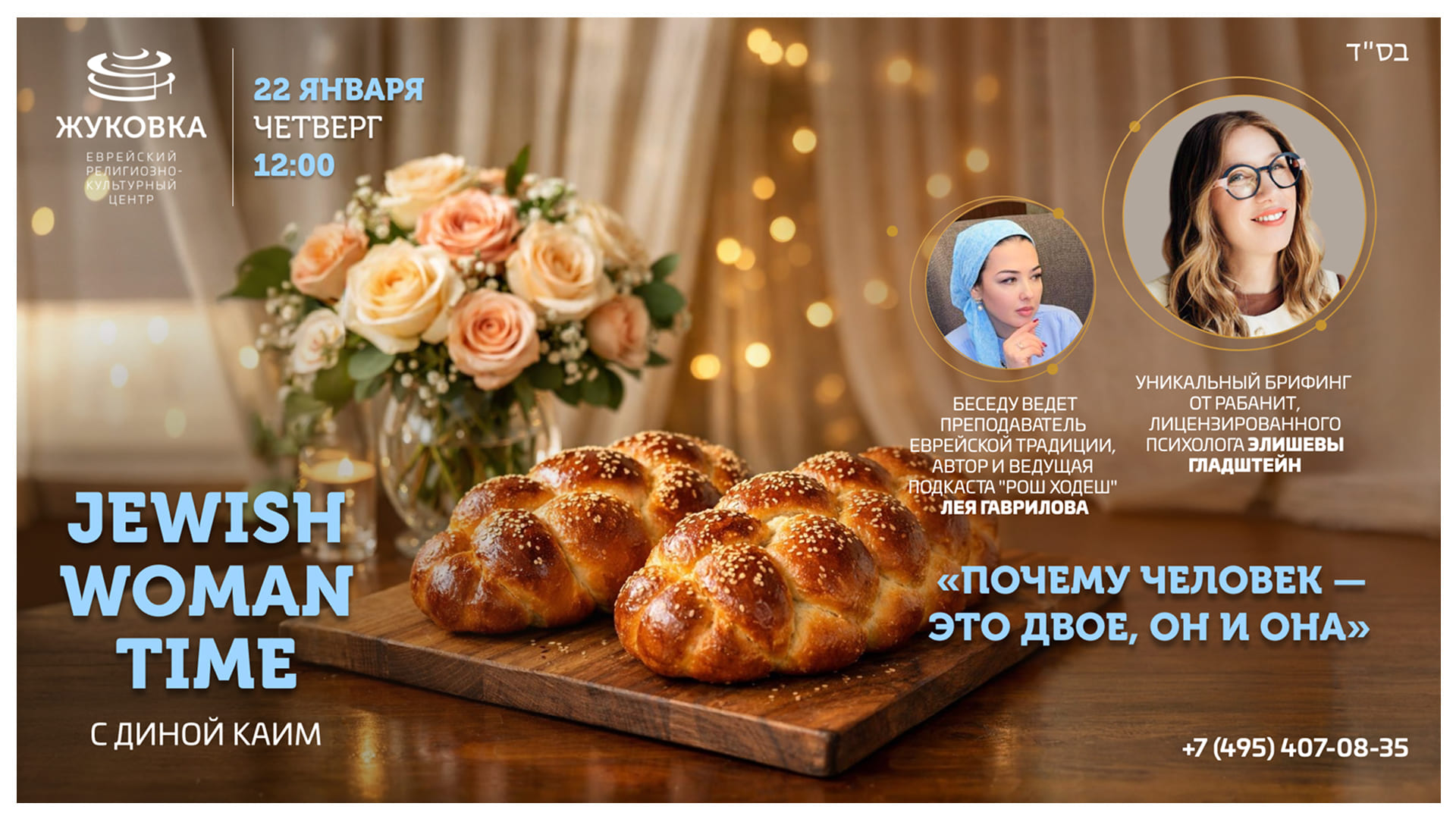 Приходите в ближайший четверг на уникальный брифинг по теме: "Почему человек это двое, он и она". У нас в гостях Рабанит из Израиля, спикер Общины "Яд Рама" в Иерусалиме, лицензированный психолог в частной практике, лектор на тему интеграции Торы и психологии Элишева Гладштейн супруга Рава Элиягу Гладштейна!
